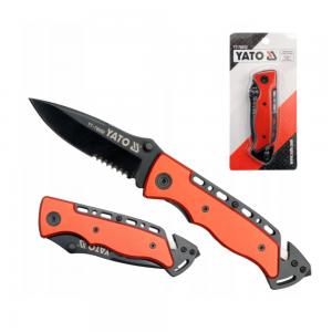 Folding knife YATO with a black drop point blade, 95 mm long, two-piece blade on the outside, straight on the inside, serrated increasing the scope of the knife's application, possibility of opening with one hand, lock accidental closure, strong steel body with ergonomic anodized lining, on the back part of the handle built-in safety belt cutter and window hammer, steel belt clip